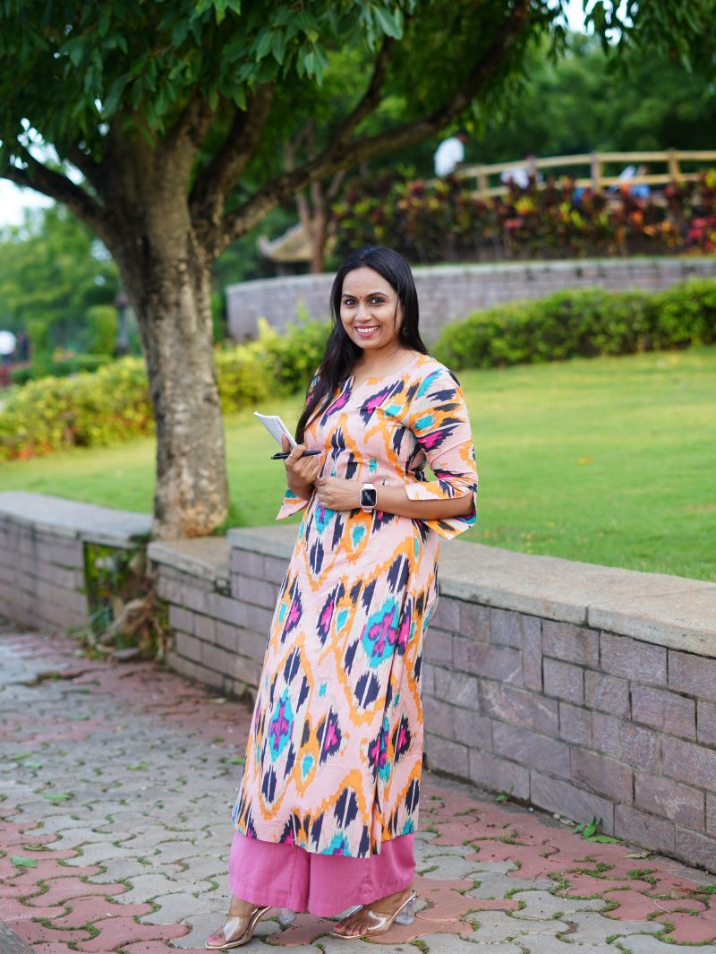 2 reviews for Pure Cotton A-Line Kurti | Pastel Peach Ikkat Style Print
