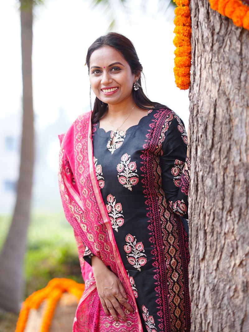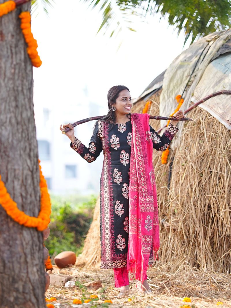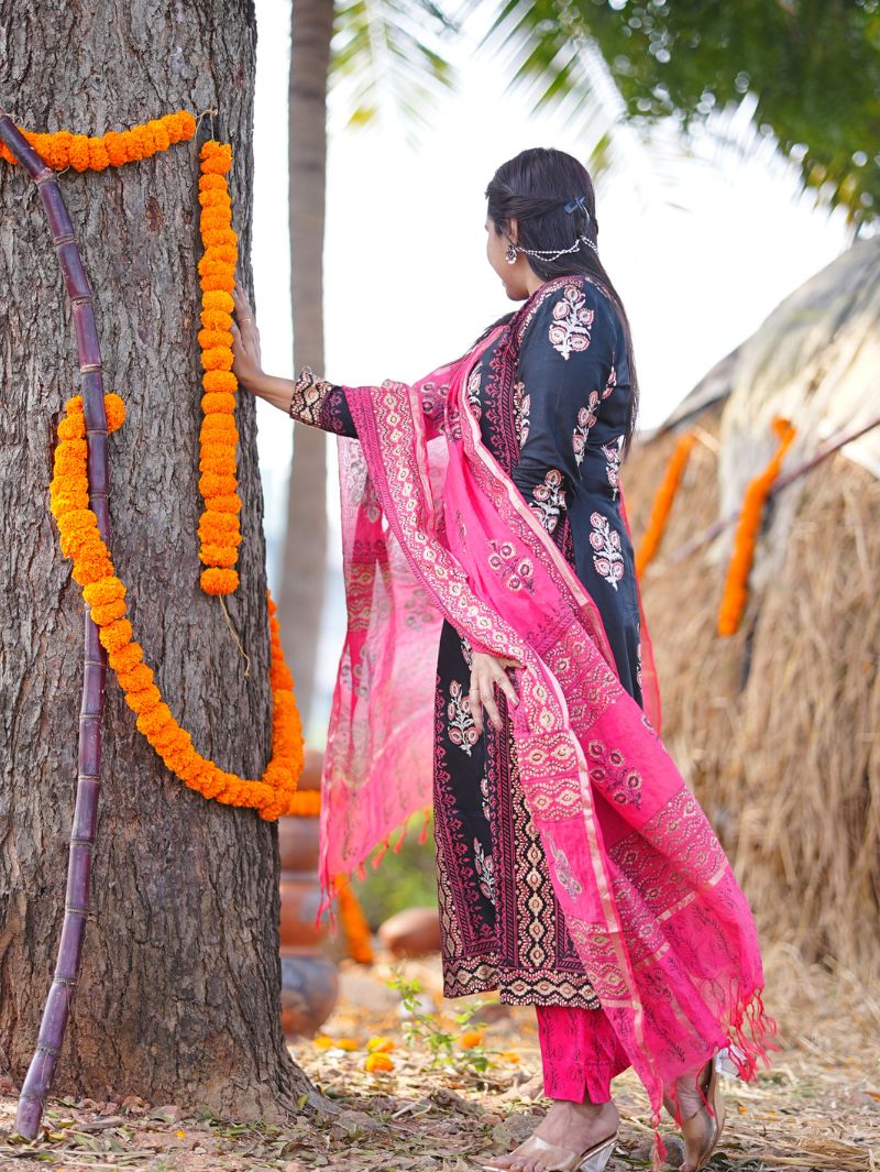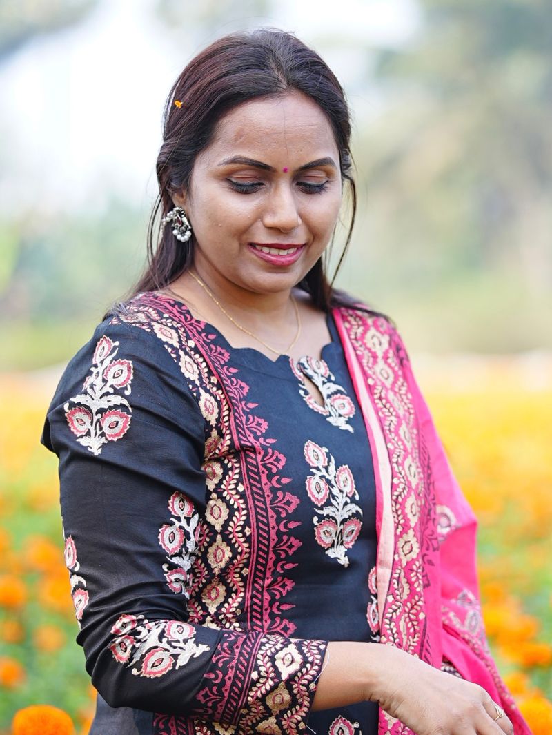 SJ-24 features premium cotton-silk crafted in a heritage-inspired palette accented with antique-tone handblock motifs. The elegant scalloped neckline with teardrop cutwork adds refined character. Paired with coordinated pants and a pure Chanderi cotton dupatta, this set balances richness with breathable comfort. Thoughtfully tailored with soft lining, SJ-24 reflects timeless ethnic sophistication.