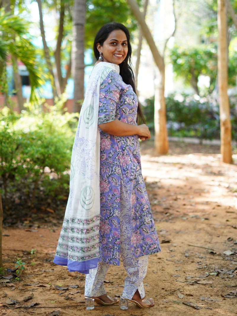 Introducing SJ-3, a Jaipur handblock cotton 3-piece suit set crafted in breathable pure cotton. The traditional wooden block printing technique gives each piece subtle handcrafted character. The straight-cut kurta is paired with a coordinated pant and matching dupatta, creating a complete and balanced ethnic ensemble. The lightweight fabric ensures comfort while maintaining refined structure. Elegant, minimal, and versatile, SJ-3 is perfect for office wear and polished everyday styling.