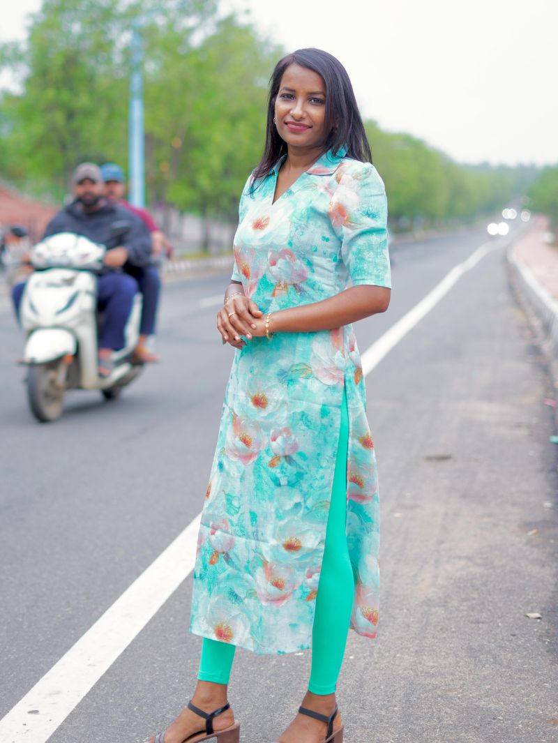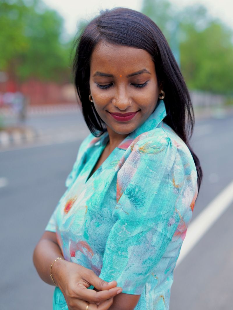 SJ-6 showcases a refreshing mint green floral design crafted in heavy vintage-feel linen cotton. The fabric offers structure and a premium fall while remaining breathable and comfortable. Designed in a straight-cut silhouette with a collared V-neckline and subtle puff at the shoulders, this kurti delivers refined elegance. Soft cotton lining enhances comfort and wearability. Ideal for office styling and polished casual wear, SJ-6 balances colour freshness with timeless tailoring.