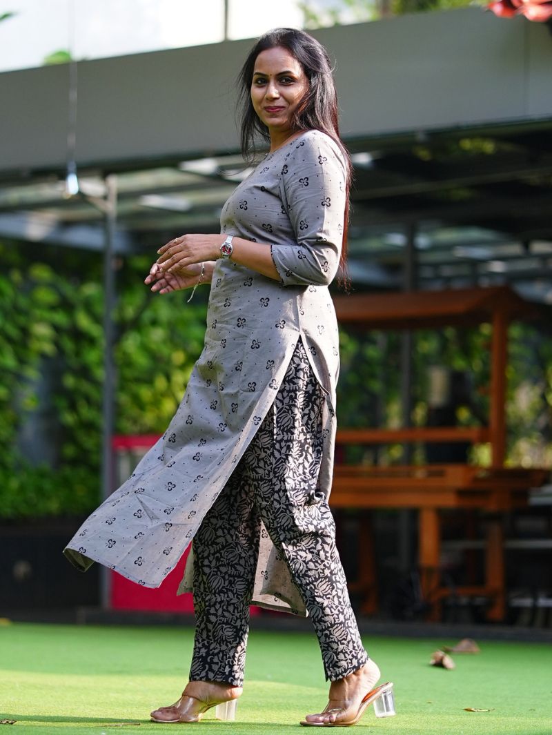 SJ-22 blends pure handblock cotton for the kurti with printed cotton for the bottom, creating a refined mix-and-match ensemble. Minimal button neckline detailing enhances clean structure, while breathable cotton ensures day-long comfort. Designed for office wear and relaxed ethnic outings, SJ-22 balances contrast and cohesion effortlessly.