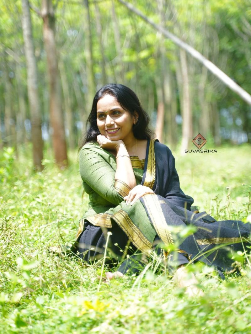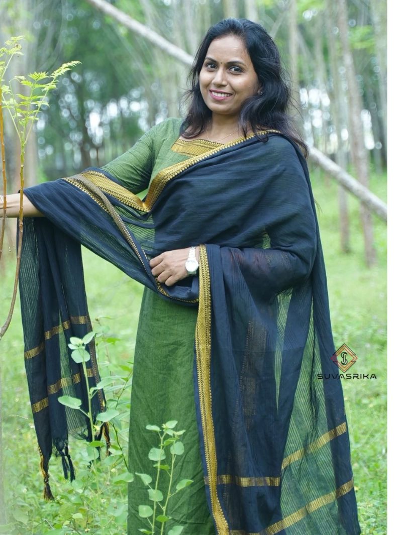 1 review for Pure Mangalagiri Cotton 3-Piece Suit Set | Leaf Green with Black Dupatta