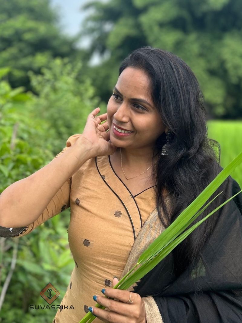 SJM-16 is crafted in an elegant wheat tone using pure handloom Mangalagiri cotton. The breathable fabric offers structured fall while maintaining lightweight comfort. Designed with a curved V-neckline and subtle piping, the kurta pairs with pleated pants and a contrast black dupatta. Puff sleeves add refined detailing. Ideal for office wear and cultural gatherings, this set balances subtle colour with timeless tailoring.