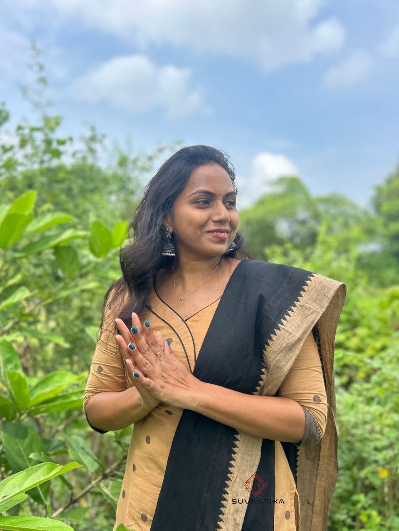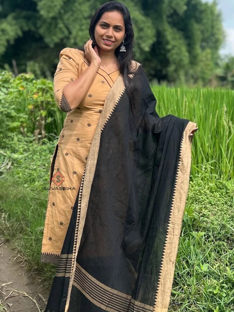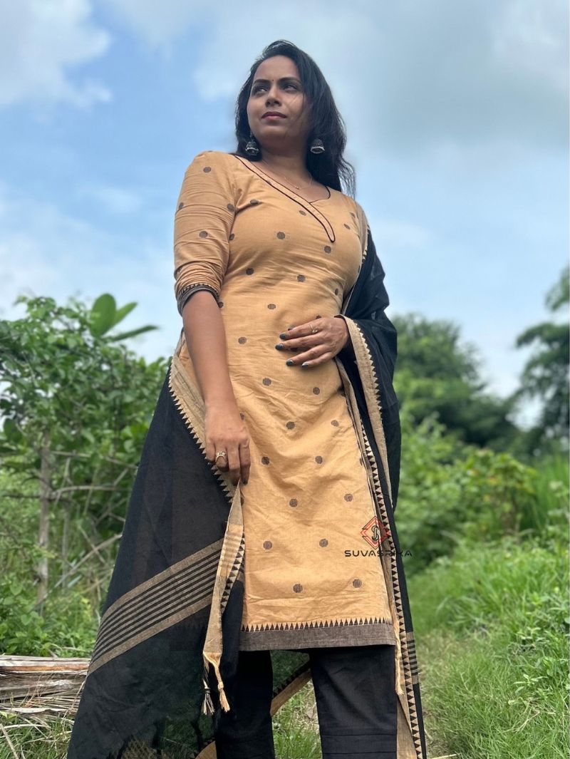1 review for Pure Handloom Mangalagiri Cotton 3-Piece Set | Wheat Tone with Black Dupatta